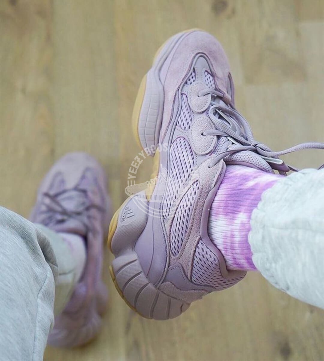 Adidas Yeezy 500 «Soft Vision» були розроблені в рамках колаборації Adidas x Yeezy. Реліз кольору відбувся 2 листопада 2019 року. Верх кросівок Yeezy 500 «Soft Vision» виготовлений з сітки mesh та замші, а підошва приховує амортизаційну технологію adiPRENE+. Кросівки Yeezy 500 оснащені пінною устілкою Ortholite з ефектом пам’яті та чіпкою підметкою, яка забезпечує високий рівень комфорту та не залишає слідів на поверхні. Рефлективне покриття нанесено на язичок і елементи шнурівки. Брендування обмежене логотипом Adidas Performance на носку кросівок. У цій лінійці бренду Каньє Веста втілюється гармонійне поєднання ретро-стилю в сучасному виконанні. Кросівки Yeezy 500 по праву вважаються справжньою класикою бренду.