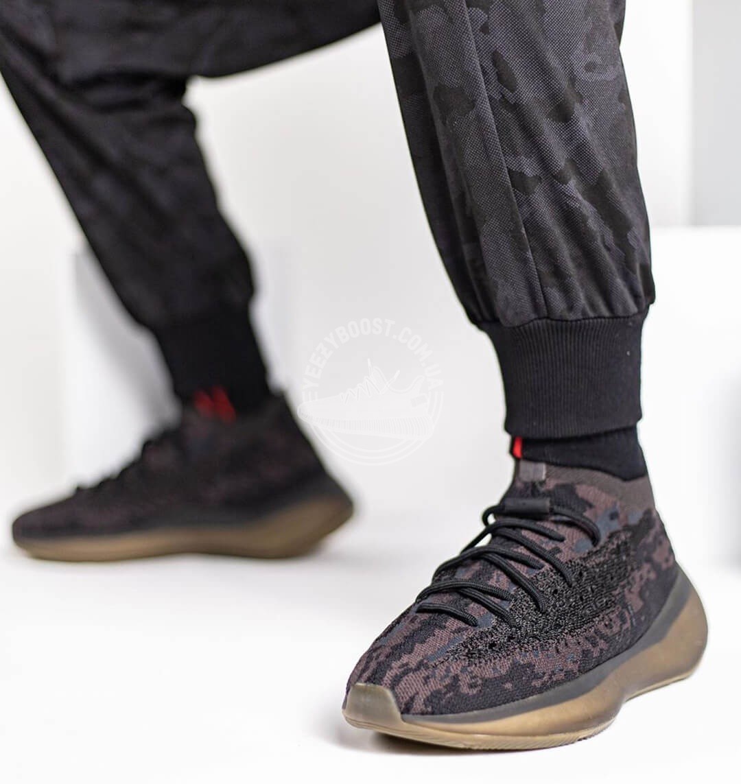 Adidas Yeezy Boost 380 “Onyx Reflective” – шостий колір з нової серії Yeezy 380, реліз якого був підготовлений до чорної п’ятниці 2020 року. Назва релізу відсилає до мінералу оніксу — відомого різновиду кварцу з характерним переливчастим відтінком. Верх Yeezy 380 “Онікс Рефлектив” виконаний у темно-камуфляжному кольорі з модернізованого світловідбивного матеріалу Primeknit. Варто відзначити відносно високий виріз, що облягає ногу навколо щиколотки, нагадуючи носок. Зручність при надяганні взуття забезпечують еластичні шнурки без зав’язок. Хорошу вентиляцію створюють перфоровані смужки з обох боків кросівка. Напівпрозора висока підошва приховує амортизаційну технологію Boost, а коричнева підметка завершує футуристичний дизайн моделі. Yeezy Boost 380 “Onyx” представлені у рефлективній та не рефлективній версії.