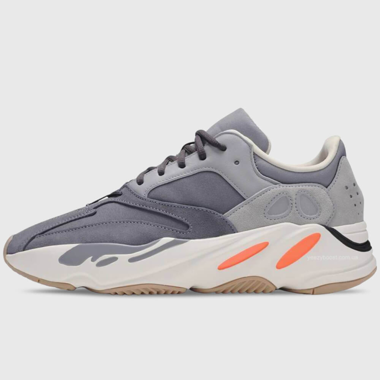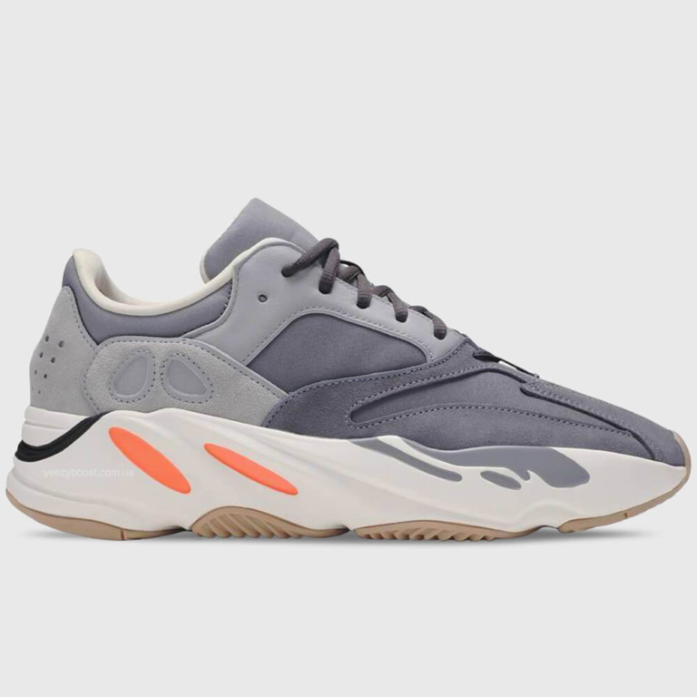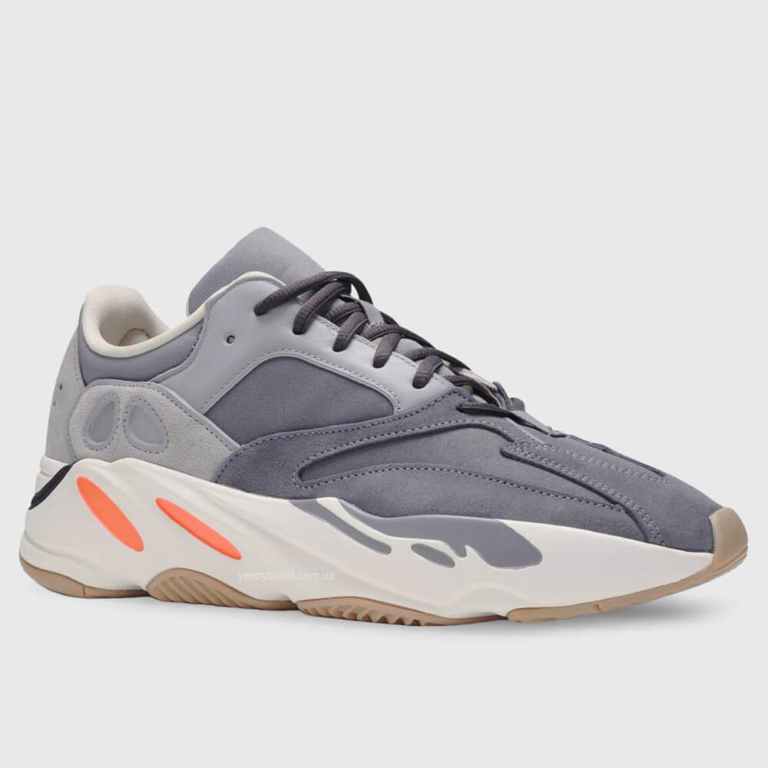 Adidas Yeezy Boost 700 «Magnet» були розроблені в рамках колаборації Adidas x Yeezy. Реліз кольорової гами відбувся 9 вересня 2019 року. Кросівки Yeezy Boost 700 «Magnet» виконані з преміальної замші сірих відтінків, неопрену, що відрізняє їх від попередніх моделей 700-х, і натуральної шкіри на знайомому силуеті з масивною підошвою білого кольору, в якій прихована амортизаційна технологія Boost. Зовнішній брендинг моделі Yeezy Boost 700 обмежений логотипом Adidas Performance на гумовій підошві кольору gum. Світловідбивні вставки можна знайти і на самих кросівках, які виконані у формі «Cat Eye» і двох віконцях оранжевого кольору в проміжній підошві. Кросівки Adidas Yeezy Boost 700 – це бездоганний рівень комфорту і амортизації в будь-якій ситуації.