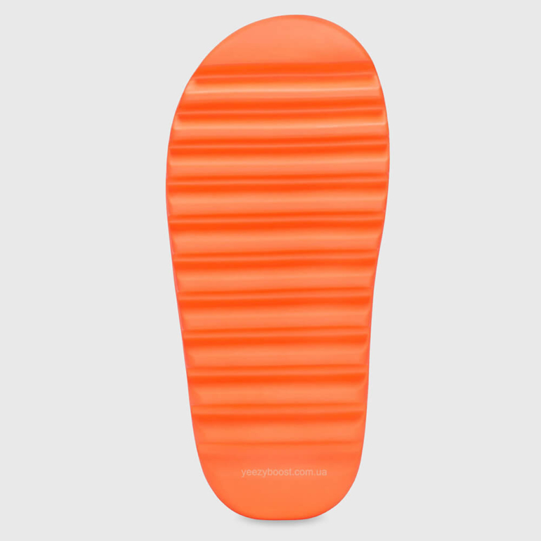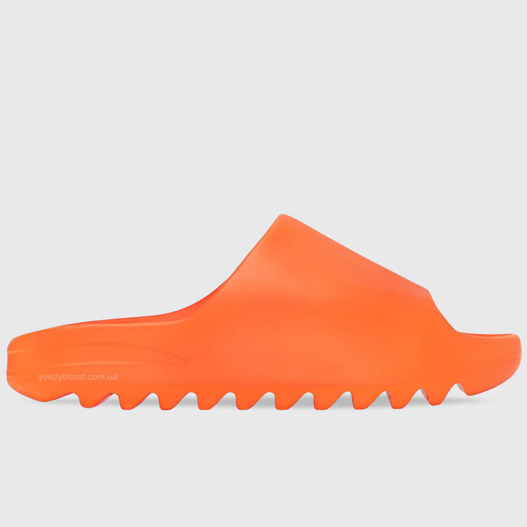 Adidas Yeezy Slide «Enflame Orange» були розроблені в рамках колаборації Adidas x Yeezy. Реліз кольору відбувся 21 червня 2021 року. Окрім кольору «Enflame Orange», одним із найяскравіших і найпомітніших вважається також колір Yeezy Slide «Glow Green». Незважаючи на те, що шльопанці мають мінімалістичний дизайн, вони не такі прості, як можуть здатися на перший погляд. Сланці Yeezy Slide виготовляються з м’якої піни EVA, що робить їх легкими та міцними протягом усього часу. Завдяки спеціальним канавкам в області пальців, подушечок і п’яти, стопа надійно фіксується, а ребриста підошва забезпечує зчеплення на слизьких поверхнях, завдяки чому ви отримуєте максимальний комфорт і захист від ковзання. Зовнішній брендинг обмежений логотипом Adidas Performance на подушечці в області п’яти та вигравіруваним написом YEEZY на внутрішній частині сланців. Adidas Yeezy Slide – це неймовірна легкість та максимальна амортизація.